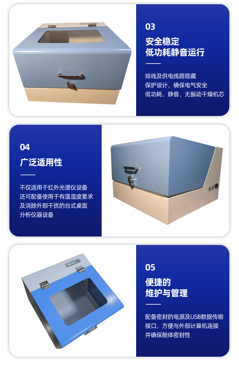 DRY-04智能電子防潮箱電子防潮箱,專為賽默飛 IS50 紅外光譜儀量身定制,以領先的防潮技術,為精密儀器筑牢安全防線。搭載高性能電子除濕機芯,結合微電腦濕度控制系統,具備節能低耗、靜謐無噪、濕度直觀顯示等顯著優勢。作為專為傅立葉變換紅外光譜儀量身定制的配套附件,其精密的防塵防潮設計,可有效提升設備核心部件的使用壽命,為儀器的穩定運行與精準檢測提供可靠保障。- 產品描述